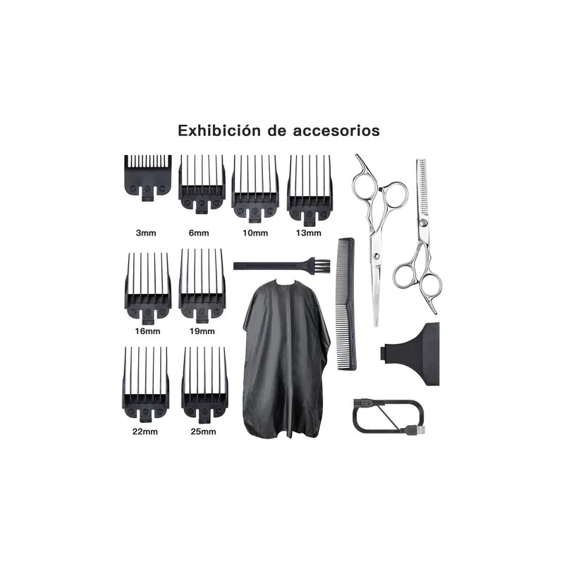Una gama completa de peines guía (3mm,6mm,9mm,13mm,16mm,19mm,22mm,25mm) para diferentes longitudes de cabello.