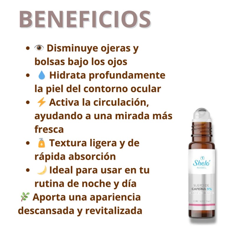 Roll on de cafeína: Refresca, descongestiona y activa la circulación en la zona de las ojeras. Su aplicación con bolita metálica brinda un efecto frío inmediato que ayuda a desinflamar y dar luminosidad.