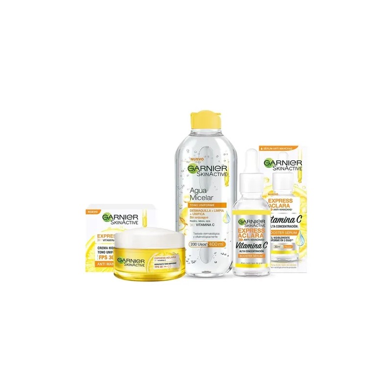Manchas en tu cara? Descubre la rutina anti manchas de Garnier Express Aclara con este nuevo kit que contiene: un agua micelar, un booster sérum anti manchas y una crema hidratante tono uniforme con FPS 30.