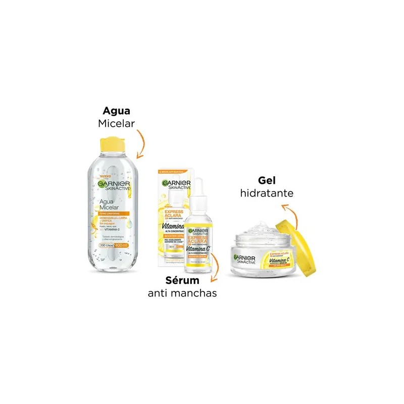 El Kit incluye: Agua micelar express aclara 400ml, Serum Vitamina C 30ml y Gel Hidratante 50ml.
