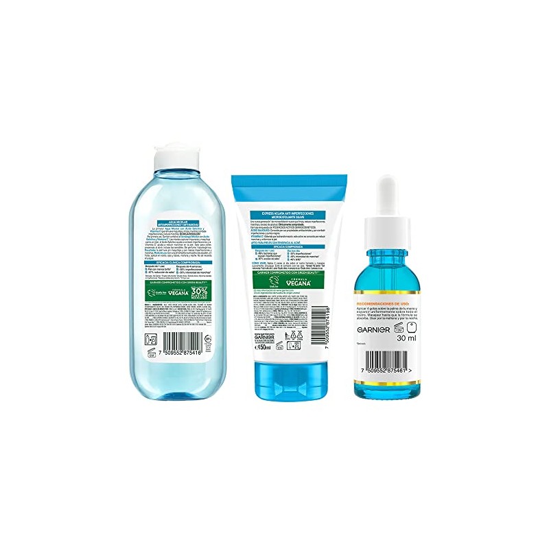 Kit Garnier Rutina Express Aclara Anti Acn 3 pasos, Agua Micelar con Acido Saliclico 400ml Micro Exfoliante Sueva Anti Acn 150ml Serum Booster Anti