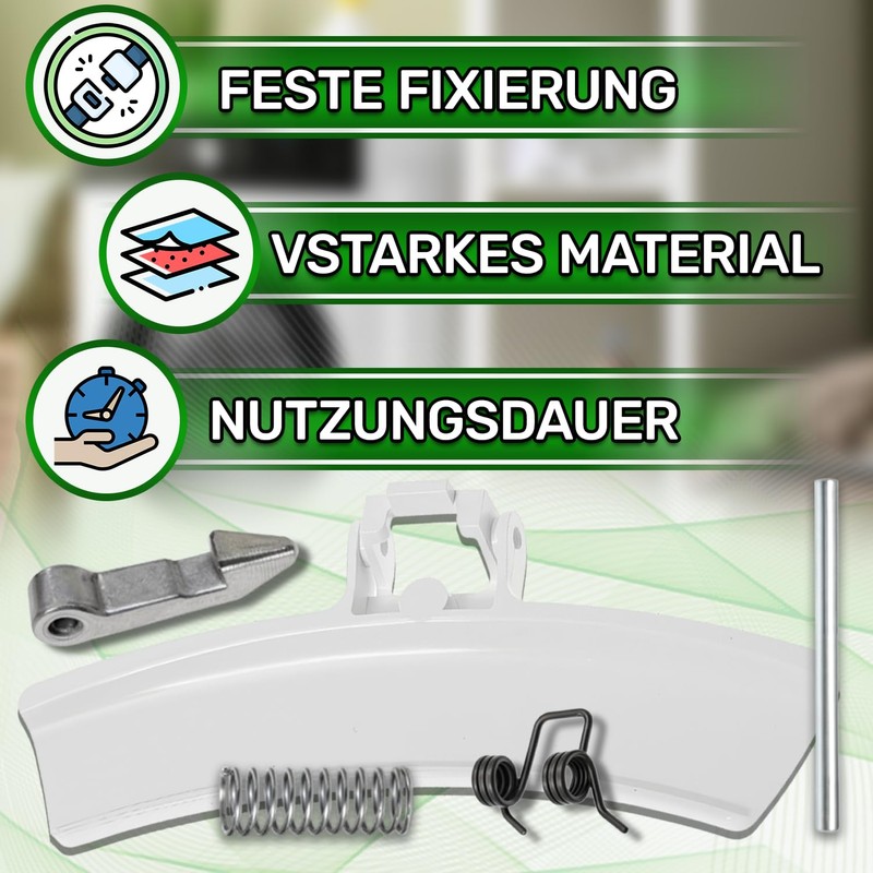 - Set – The set contains the door handle for laundry dryer, the hook, the pen and the spring. Handle dimensions: length 154, width 67 and height 20 mm. Pin diameter: 4 mm