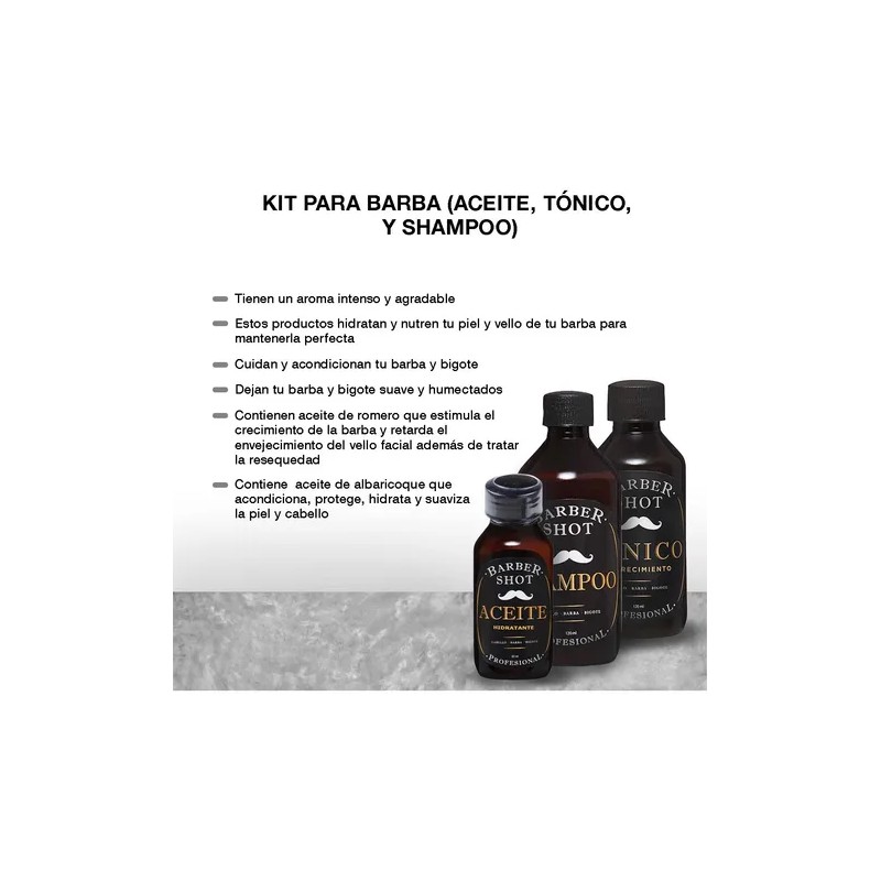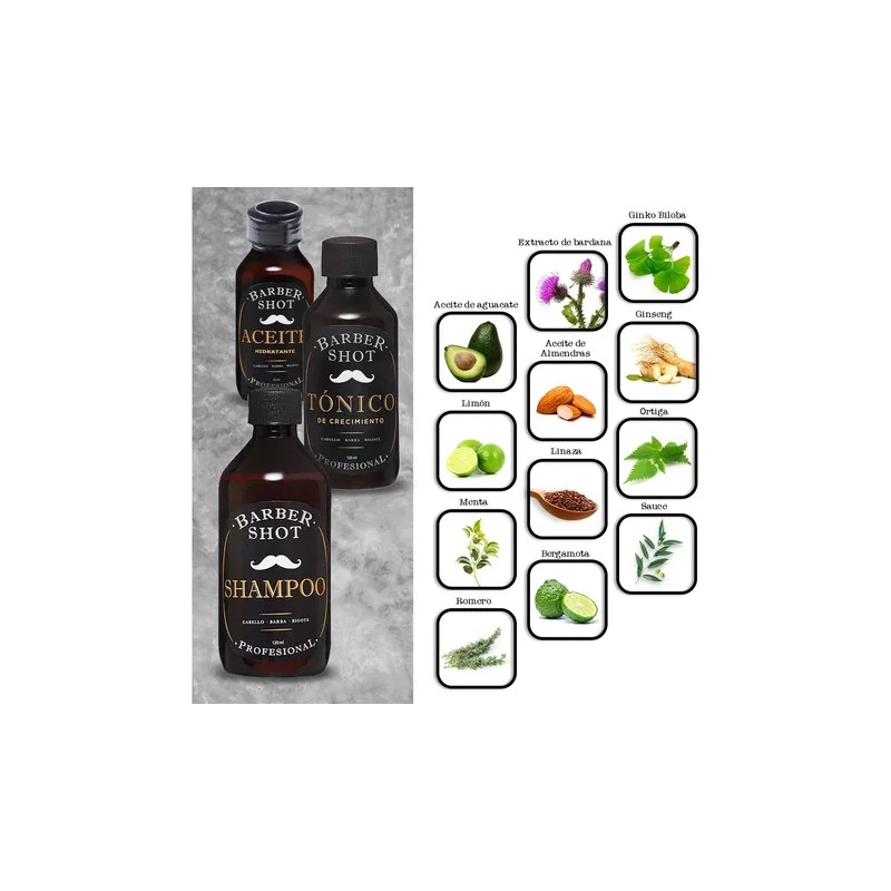 ¿Quieres lucir una barba y un cabello espectaculares, con más crecimiento, hidratación y salud? Entonces necesitas el Kit Barber Profesional, que incluye aceite, tónico y shampoo con bergamota y romero, ingredientes naturales que estimulan el folículo piloso y nutren el vello facial y la cabellera.