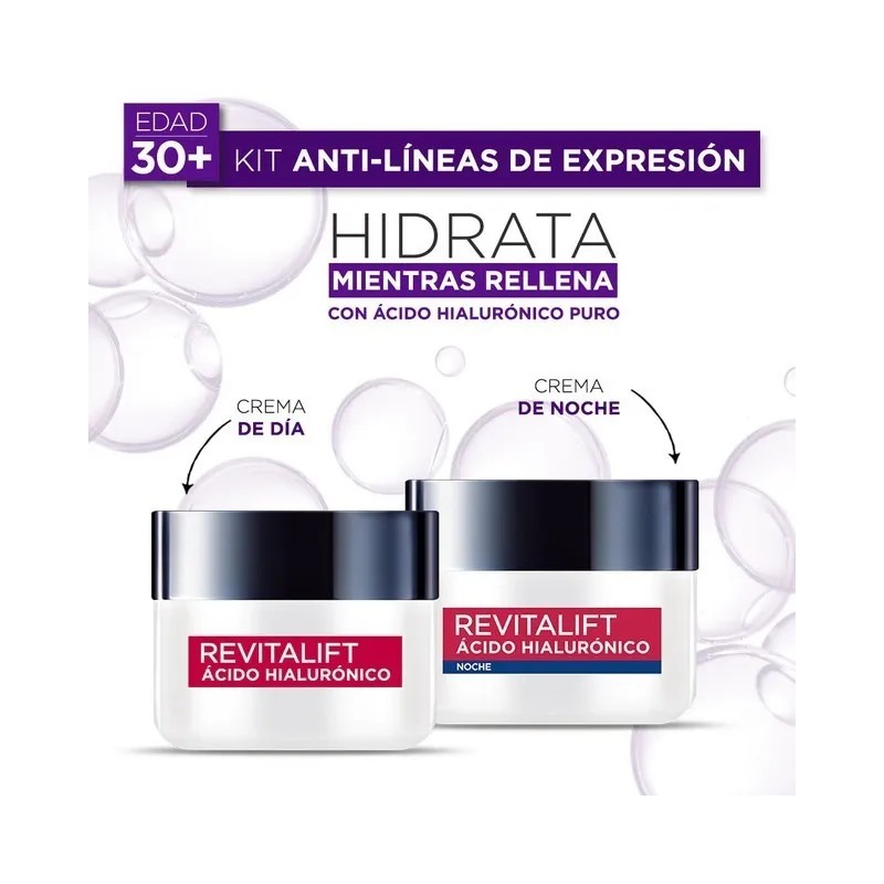 Kit Revitalift Cuidado Facial Crema De Día + De Noche 100ml Tipo De Piel Normal. Este kit de cuidado facial es ideal para mujeres a partir de los 30 años, proporcionando una rutina de día y noche antilíneas de expresión con Ácido Hialurónico. Su fórmula hidrata intensamente, rellenando las líneas de expresión. Ha sido probado con dermatólogos.