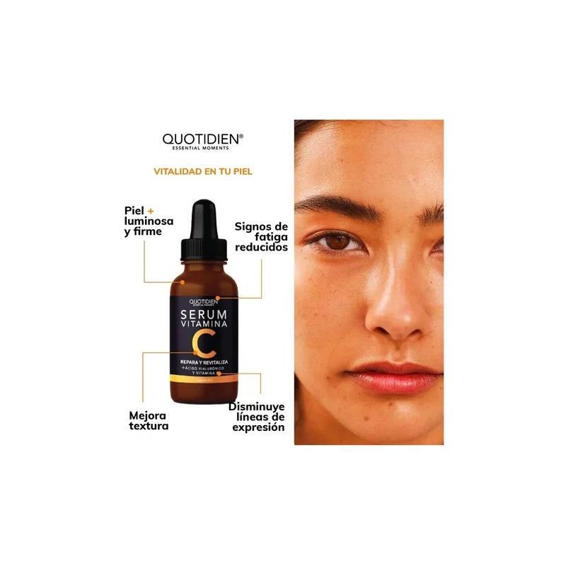SERUM DE VITAMINA C: Quotidien Serum C es un suero facial de Vitamina C Activa + Ácido Hialurónico y Vitamina E que ayudan a aclarar, hidratar, revitalizar, restablecer y tonificar la piel. El Serum de Vitamina C Quotidien contiene nutrientes esenciales para estimular la producción de colágeno, revivir la piel opaca y rejuvenecer tu rostro.