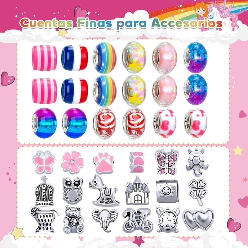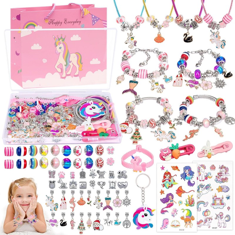 - 【Fun craft kit】: 18 metal large hole beads, 18 pendants, 18 colorful beads, 2 adjustable bracelets (bracelet length 16cm + 5cm extension chain, suitable length for most girls), 4 necklace cords, 2 stickers, 2 hairpins, 1 pink unicorn bracelet, 1 unicorn keychain, 1 stainless steel bracelet, 1 spring bracelet, 2 small rubber bands, 1 plastic storage box.