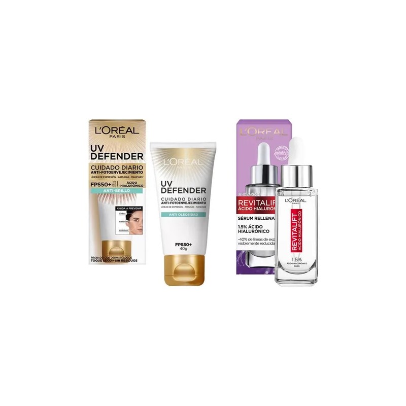 ✨ Kit L'Oréal Paris UV Defender + Sérum Ácido Hialurónico ✨