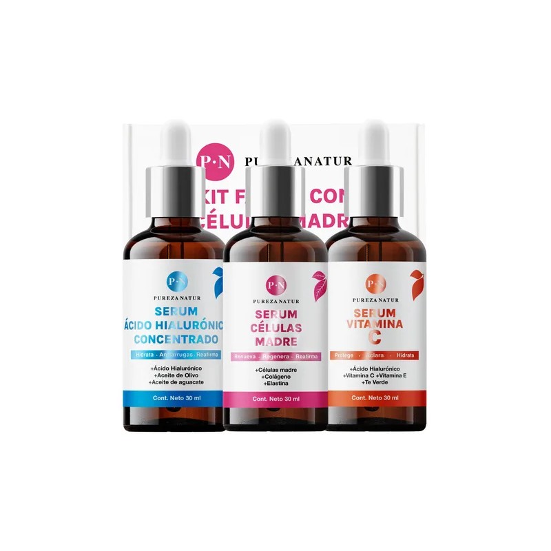 Kit Serum Vitamina C, Acido Hialuronico, Celulas Madre 3unid Momento de aplicación Día/Noche Tipo de piel Todo tipo de piel