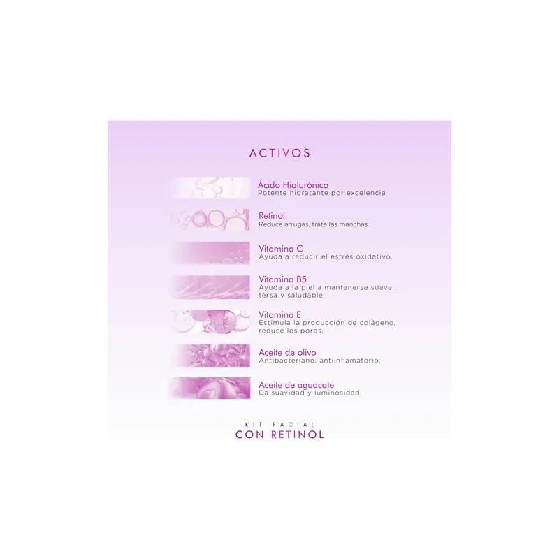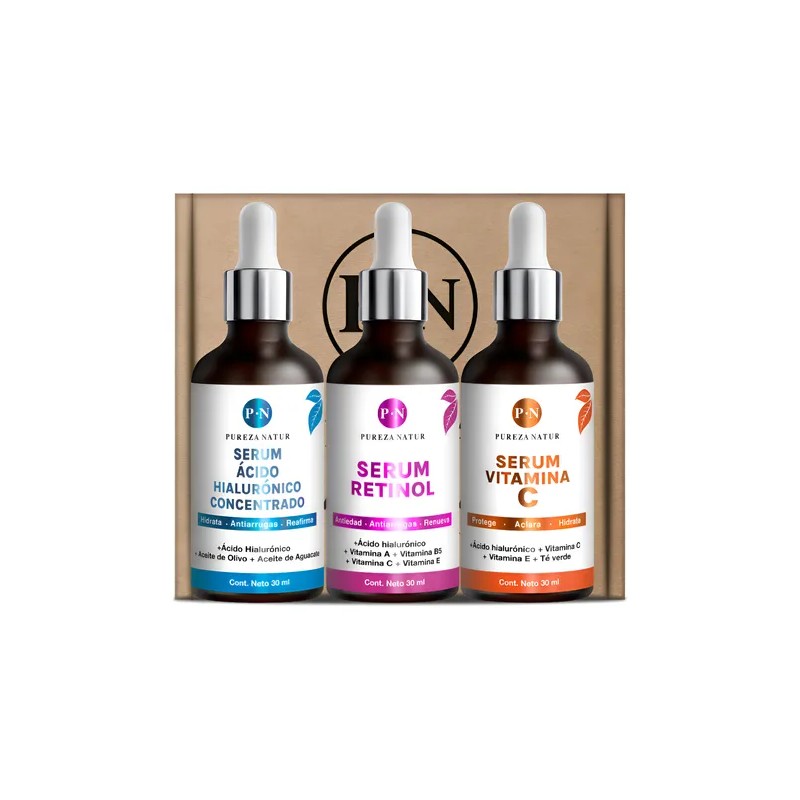 CONTENIDO: Cada KIT/ Paquete contiene 3 sueros cada uno de 30 ml, Vitamina C con ácido hialurónico + Ácido Hialurónico (hyaluronic Acid) concentrado y Retinol o vitamina A junto con otros antioxidantes e hidratantes naturales que penetran la piel y crean un efecto reparador e hidratante, para devolverle forma y color a las áreas afectadas , como ojeras, líneas de expresión, manchas y signos de edad.
