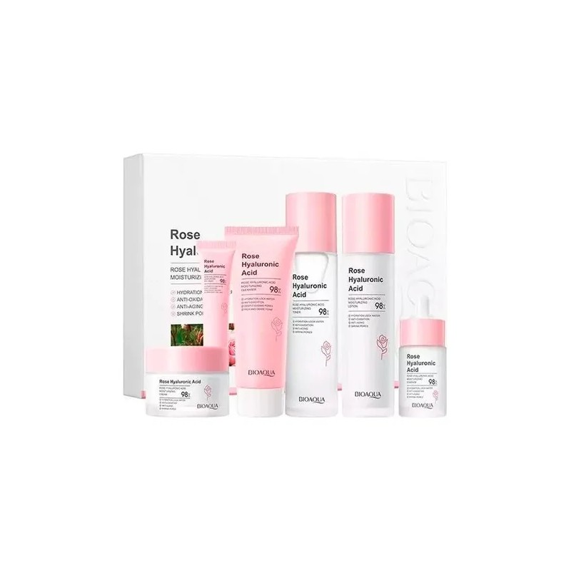 ¡Transforma tu rutina de cuidado de la piel con el kit de 6 piezas Bioaqua Rose y ácido hialurónico! Hidrata intensamente, ilumina con extracto de rosas, y reduce poros mientras combate los signos del envejecimiento. Perfecto para uso diario, de día y noche.