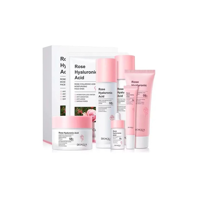 ¡Transforma tu rutina de cuidado de la piel con el kit de 6 piezas Bioaqua Rose y ácido hialurónico! Hidrata intensamente, ilumina con extracto de rosas, y reduce poros mientras combate los signos del envejecimiento. Perfecto para uso diario, de día y noche.