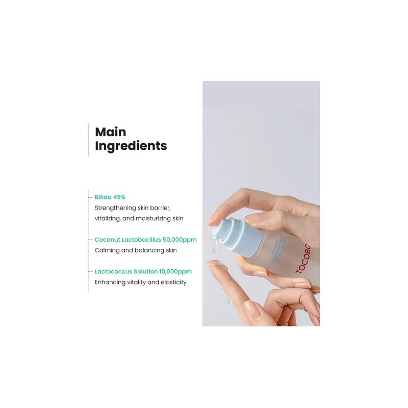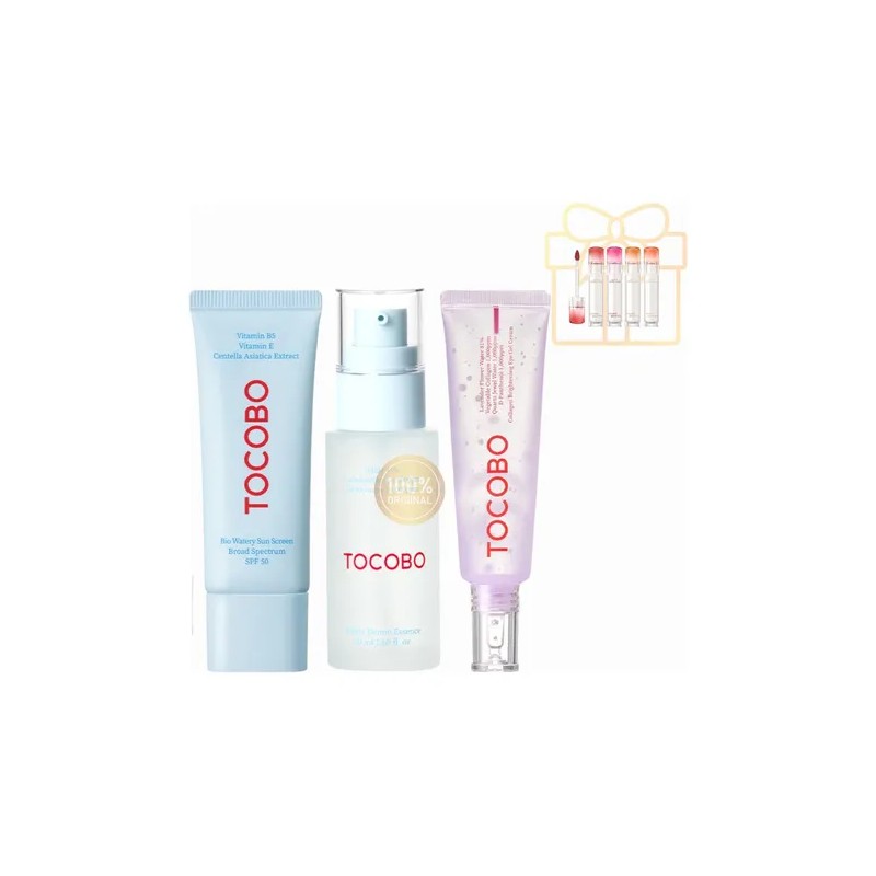 El Kit de TOCOBO que incluye Bifida Biome Essence, Bio Watery Sun Cream y Collagen Brightening Eye Gel Cream, está diseñado para ofrecer una rutina completa de cuidado facial enfocada en la hidratación, reparación de la barrera cutánea y protección solar efectiva. A continuación, se detallan los beneficios de cada producto: