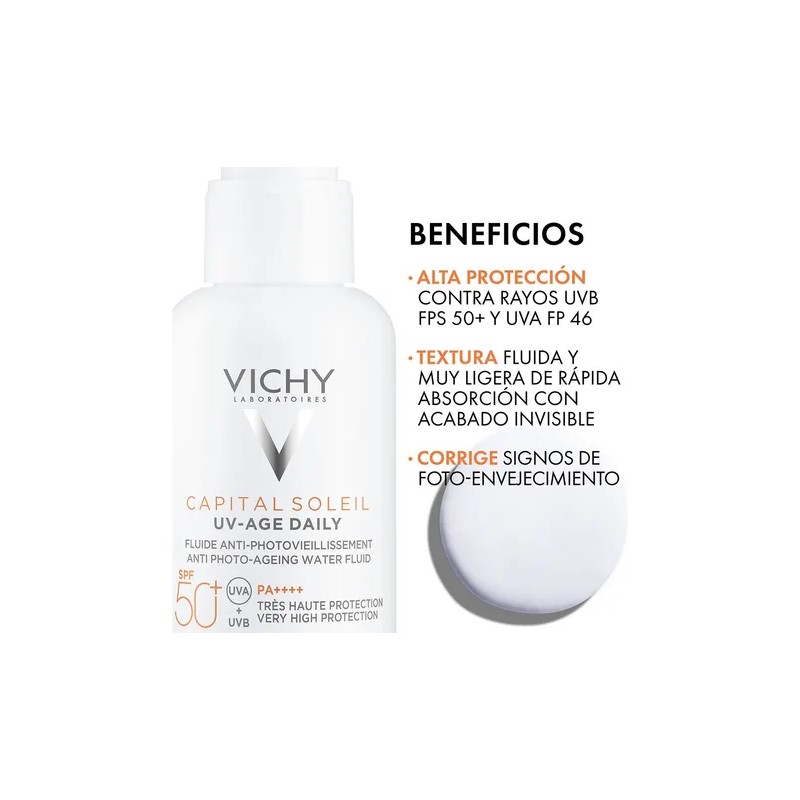 UV-AGE DAILY es el primer protector solar fluido anti-fotoenvejecimiento de Vichy. Su tecnología Netlock multipatentada forma una película protectora contra los rayos UV ultrafina y ultrarresistente para una alta protección contra los rayos UVA y UVB, responsables de más de un 80 % de los signos del envejecimiento.