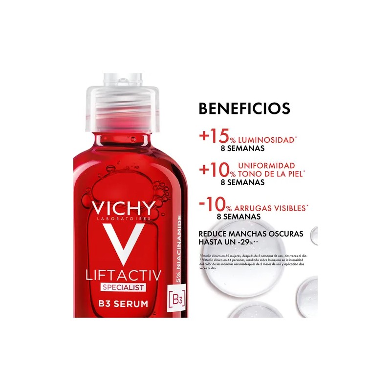 Dado que la eficacia es nuestra prioridad en Vichy, la fórmula hipoalergénica del SÉRUM MANCHAS OSCURAS B3 ha sido probada clínicamente con control dermatológico para adecuarse a todos los tipos de piel y fototipos.
