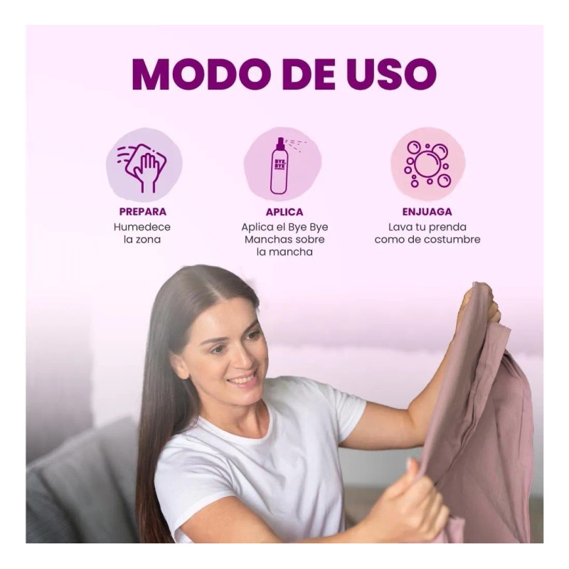 ¿Manchas frescas o secas? ¡No importa! Bye Bye Manchas es tu aliado universal contra todo tipo de suciedad. 🦸‍♀️ Su uso es tan sencillo como preparar, aplicar, enjuagar y... ¡voilà! 🪄 Observa cómo esa mancha que creías imposible desaparece como por arte de magia. Además, su fórmula ha sido testeada en gran cantidad de telas, funcionando a la perfección sin afectar el color o el tejido (excepto en rayón, acetato o seda). Así que, ¡despídete de las manchas y dale la bienvenida a un hogar más limpio y feliz! 😄