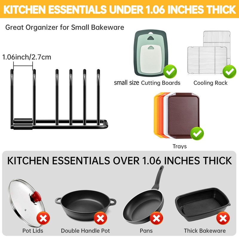 - Suitable for Different Small Size Cutting Board: Kitchen Cutting Board Organizer Rack 5-Slot Design,3 0.8-inch narrow slots+2 1.06-inch wide slots, which can be used for almost all small size cutting board on the market.note: not applicable to cookware/large thick cutting board/baking pans with a thickness greater than 1.06 inches)