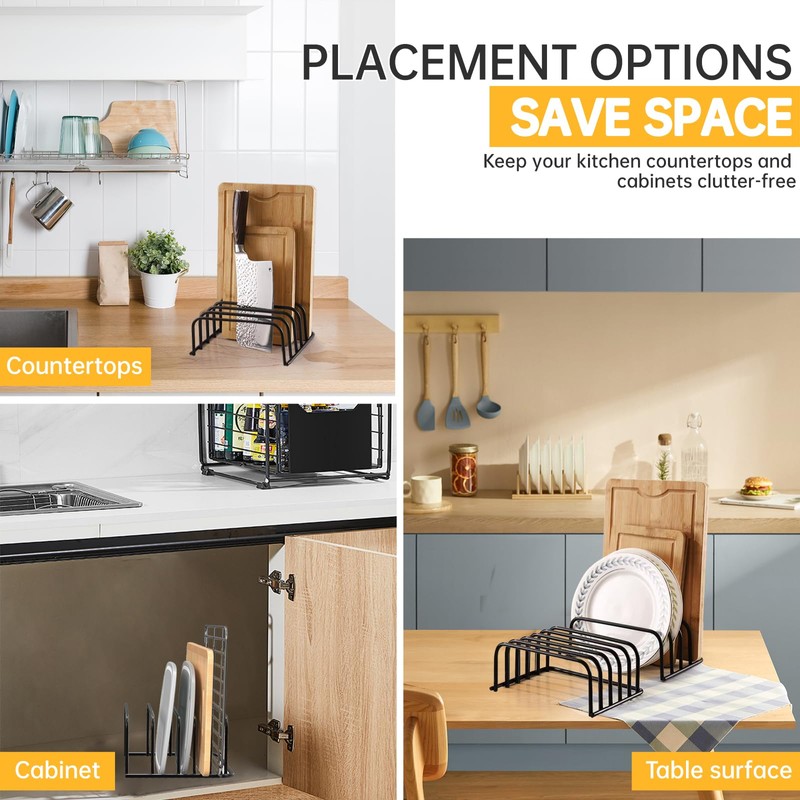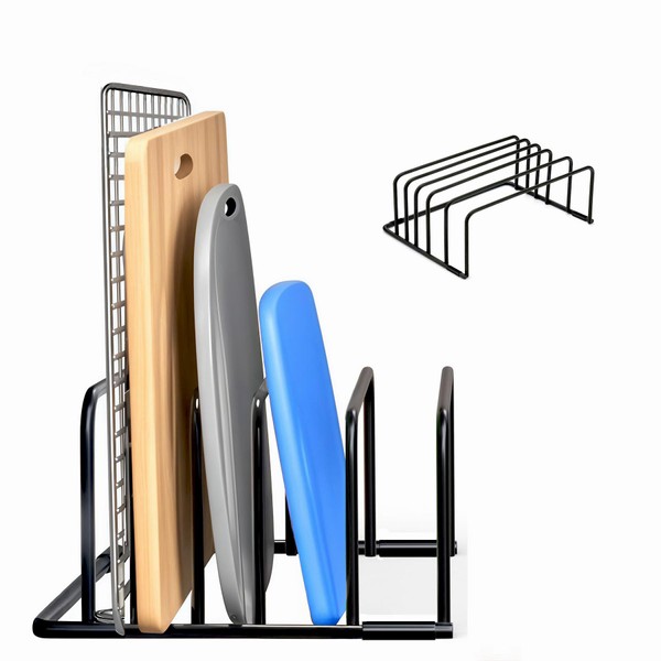 - High Quality :The cutting board organizer rack is made of high-quality iron wire, which is more firm and stable.Black matte coating enhances texture, rust and corrosion resistance, perfectly integrating into modern kitchen style. The edges are rounded to protect both hands and the tabletop, avoiding accidental scratches during retrieval and placement