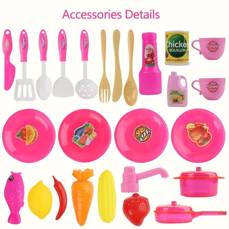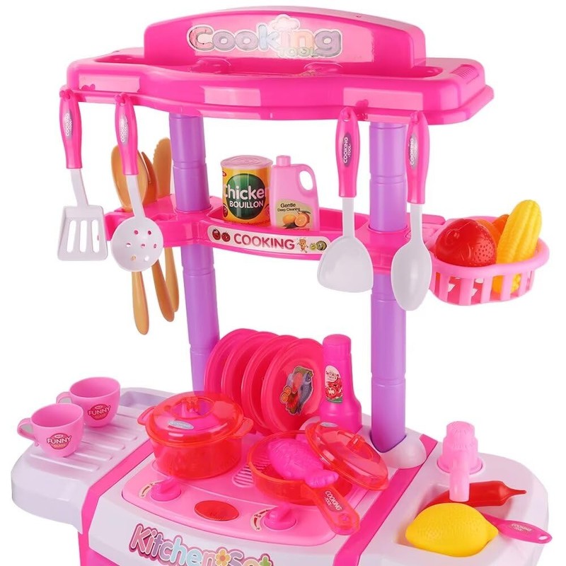 - Game kitchen set: This children's game kitchen set includes a variety of kitchen toys, such as knife, spoon, spatula, fork, cup, dishes, pot pan, stove, oven, game food and other accessories.