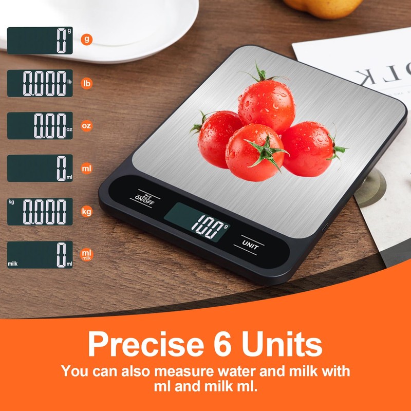 • ✅【Multifaceted Kitchen Scale】Crafted to handle every task, this digital kitchen scales encompasses six measurement units: g, kg, lb, oz, ml, and milk ml, making your culinary and packaging tasks a breeze. 2*AAA battery included
