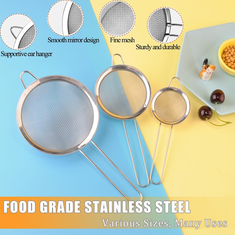 - 3 different sizes are essential for the kitchen, suitable for filtration and sieving, diameter 8 cm/12 cm/16 cm and handle 11.5 cm/12.5 cm/14.5 cm.