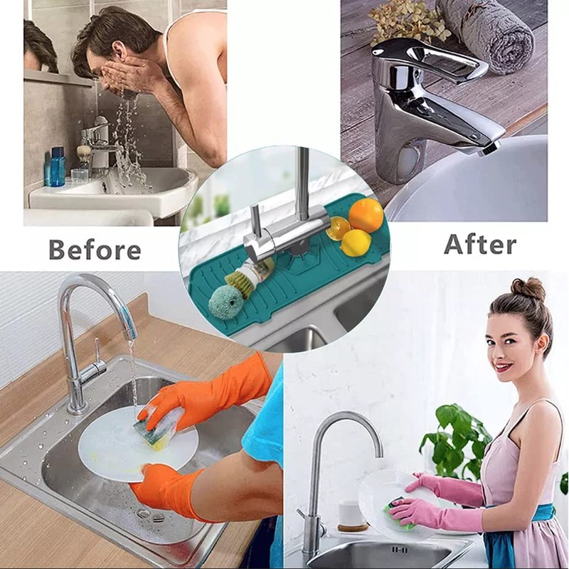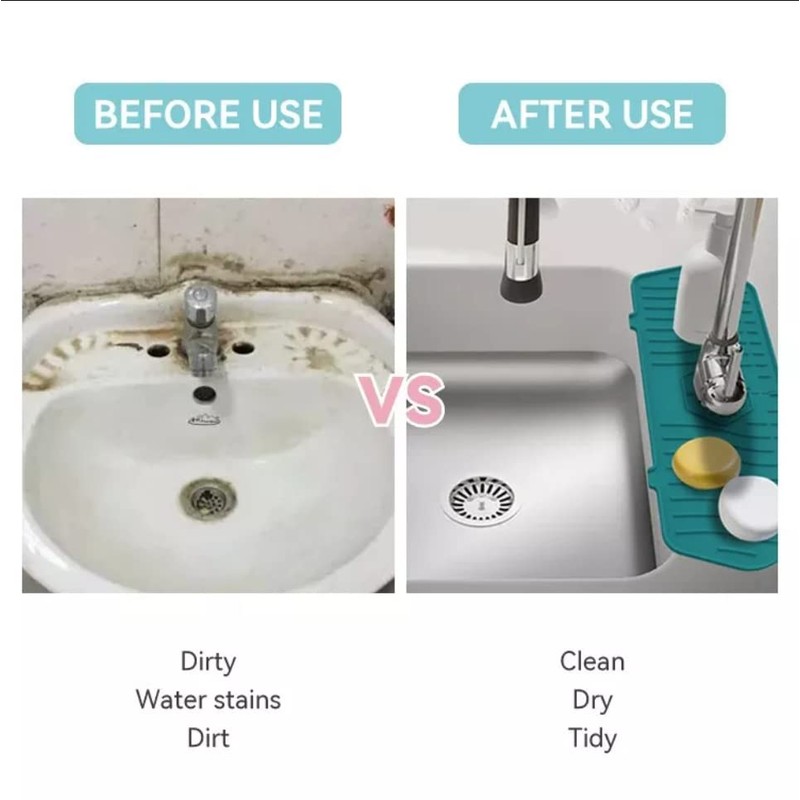 - (AUTO DRAINING DESING) Different from the traditional polyester, textile materials faucet pad, Our Faucet Splash Catcher has the automatic drainage function, when you wash your hands or dishes when the water droplets can be quickly caught and then quickly drain water into the sink, without worrying about the water will remain in the silicone faucet pad or countertop.