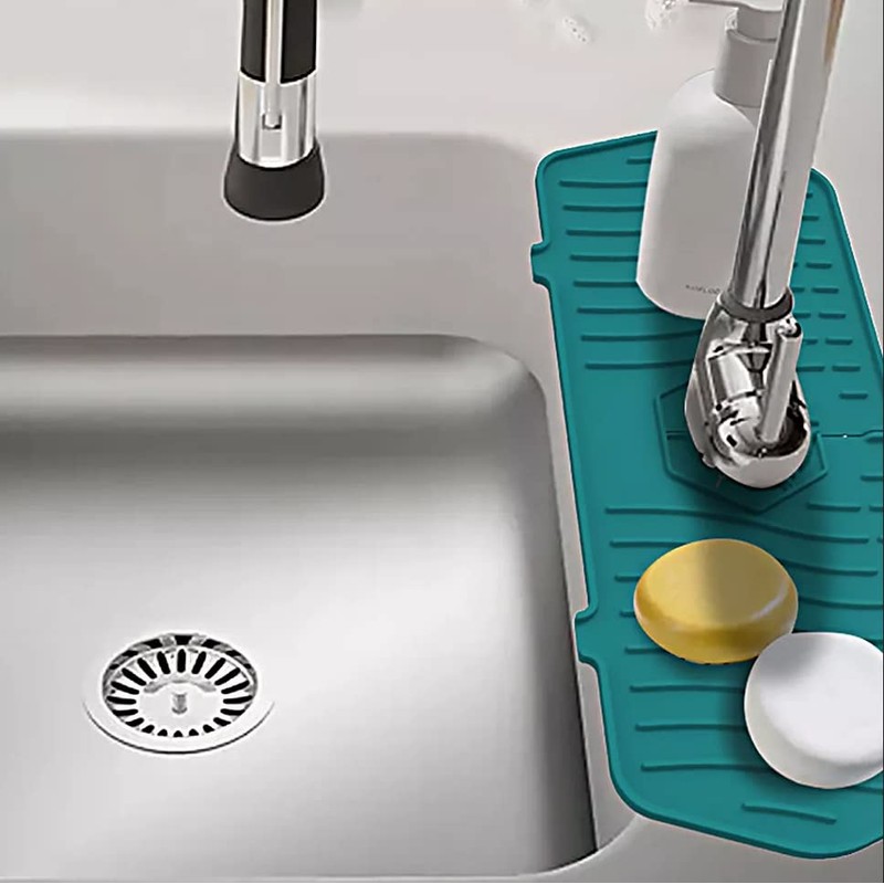 - (VERSATILE DESIGN) This faucet splash catcher mat can not only quickly collect and drain splashed water, but also can be used as a storage box for sponge, soap, detergent and much more. No need to use additional sink trays, rational use of space.