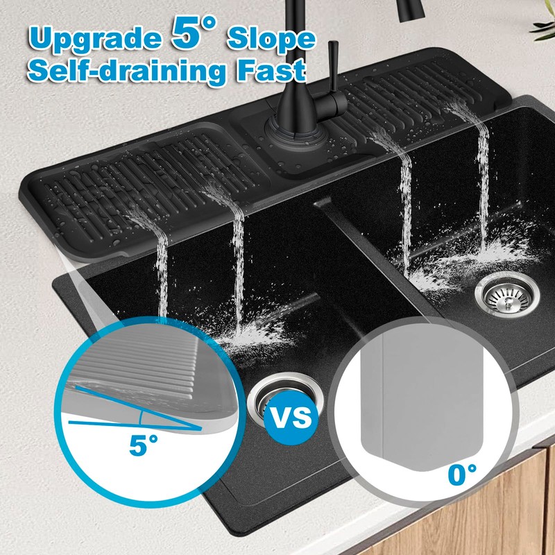 • 【Keep Your Countertop Dry】Silicone faucet mat new designed prevents water stains from the faucet splashing or leaking. Upgrading your kitchen sink & bathroom countertop in an effort-saving way! This means never gets soggy, or any water spots by the faucet and sink. You don't need to worry about the water staying on the mat or counter. It frees up your hands, reduces the frequency of wiping, always keep your countertop clean and tidy!