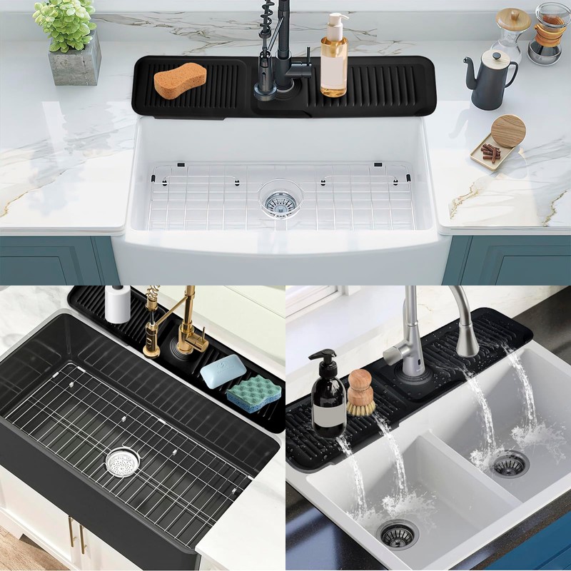 • 【Multi-Functional】It's not only a silicone sink splash guard, it also a sponge holder for kitchen sink, dish soap tray, dish drying mat, kitchen organizer, home organizer. For kitchen: put sponge, dish soap, detergent, brush, and bottle on it. Make your sink tidy and clean. It is a super practical sink mat for bathroom, kitchen, apartment, farmhouse.