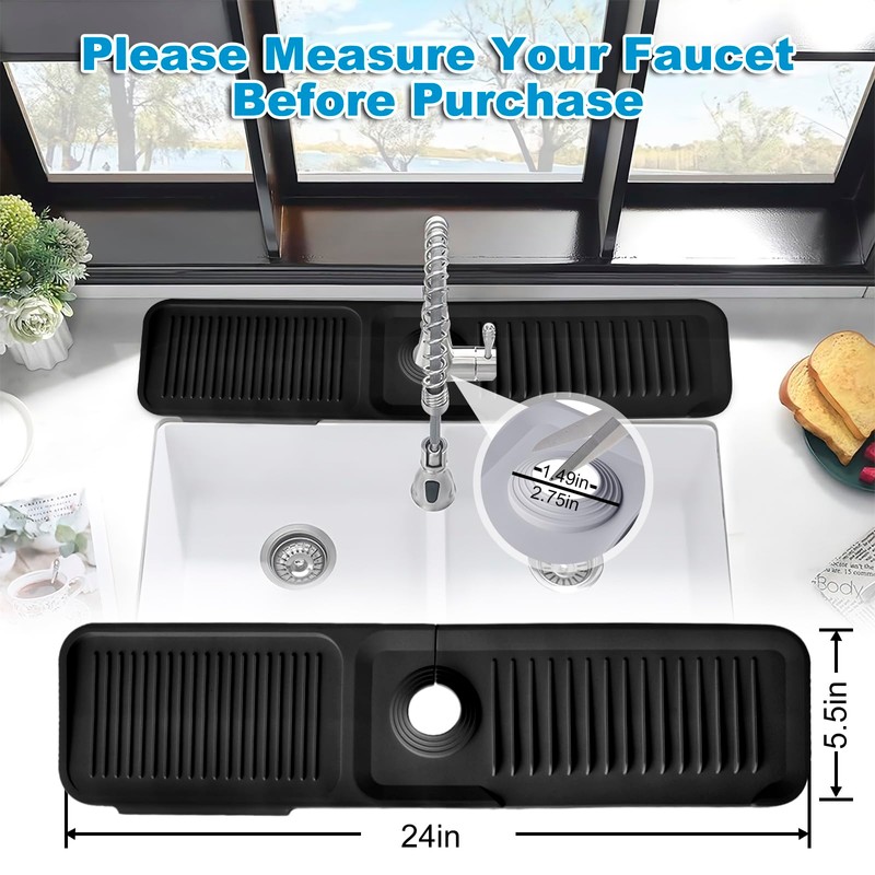 • 【Measure Before Purchasing】 Please measure the faucet and sink size before purchasing to ensure a perfect fit! The size of sink draining mat is 24" x 5.5". The diameter of faucet hole is 2.75 inches. The silicone splash guard for kitchen sink can be used in all faucet base less than or equal to 2.75 inches.
