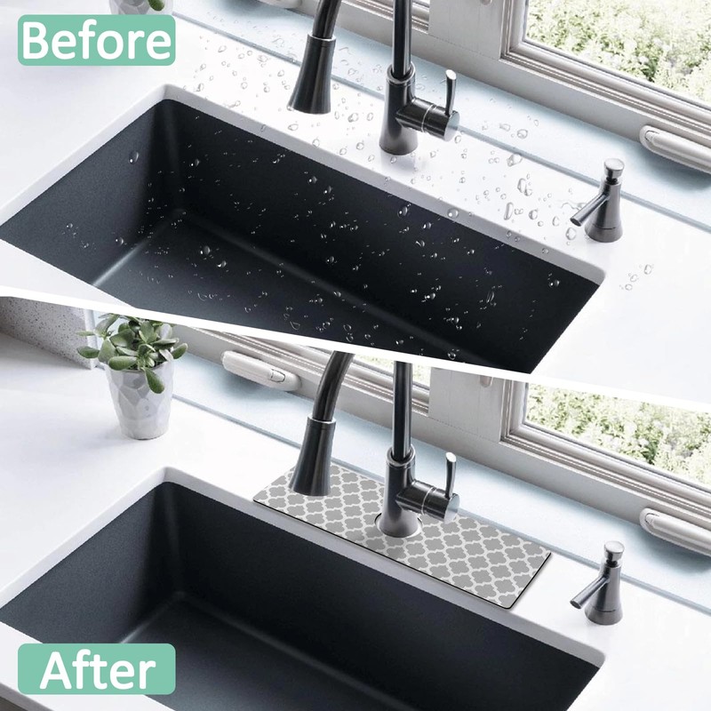 - Multifunction: The sink splash guard can be applied to sink faucets in your kitchen countertops, bathroom sinks & RV faucets. Also can put your toothbrush, cup, hand soap, and dish soap on this mat used as a small organizer mat.