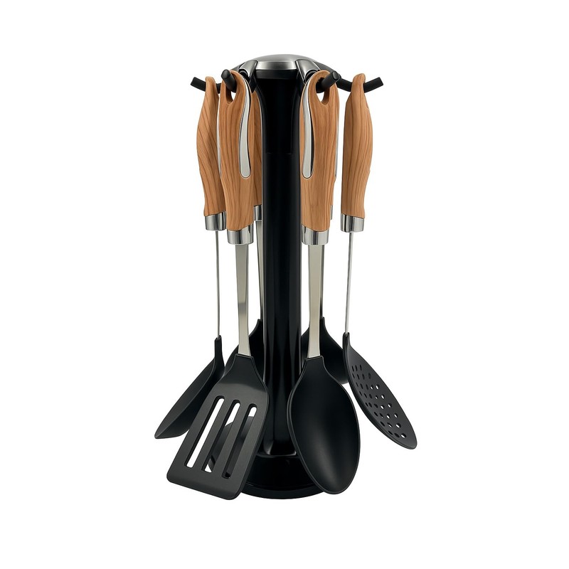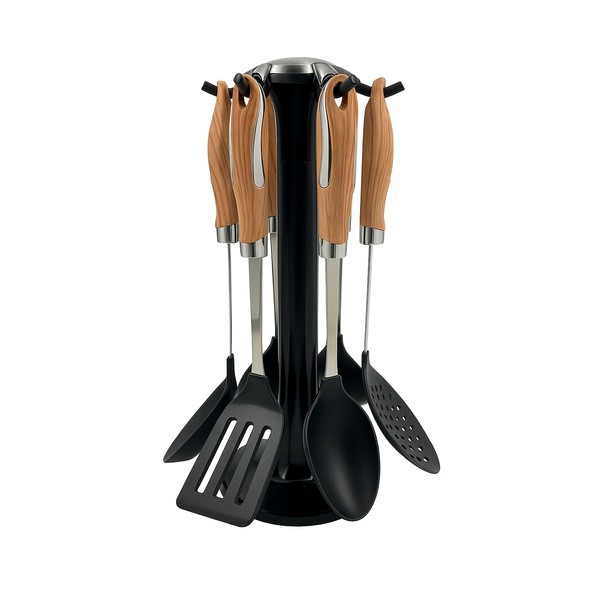 - COMPLETE SET: 6-piece kitchen utensil set includes spatulas, spoons, and strainer with a sleek rotating stainless steel storage stand for easy access