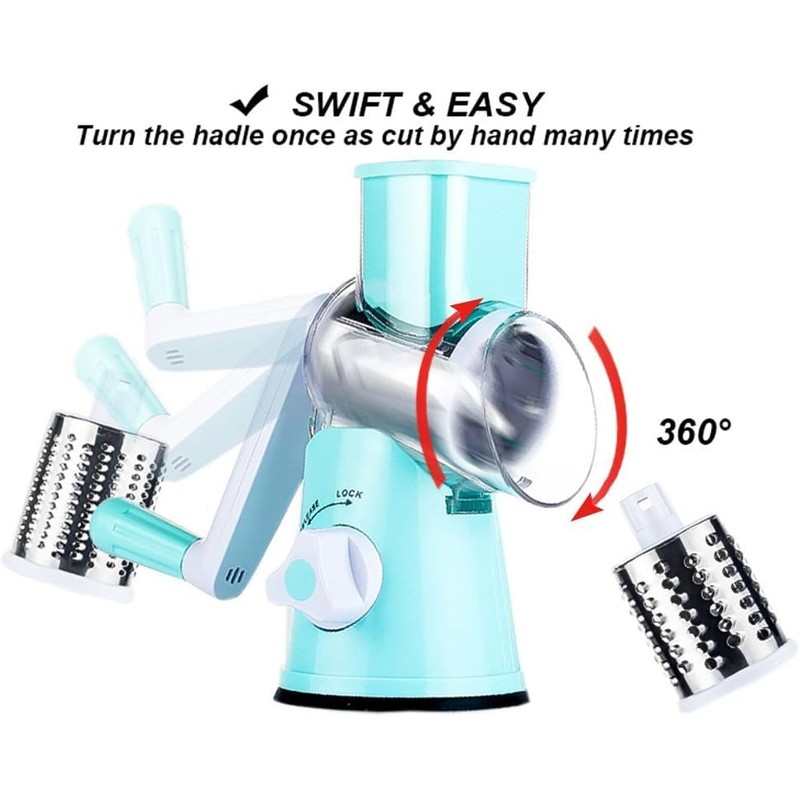 Kitchen Vibe Rotary Cheese Grater, Kitchen Manual Round Grinder Cheese Shredder With Handle, Vegetable Fruit Slicer, Easy to Clean 3 Sharp Replaceable Drum Blades Including Free Cleaning Brush, Blue