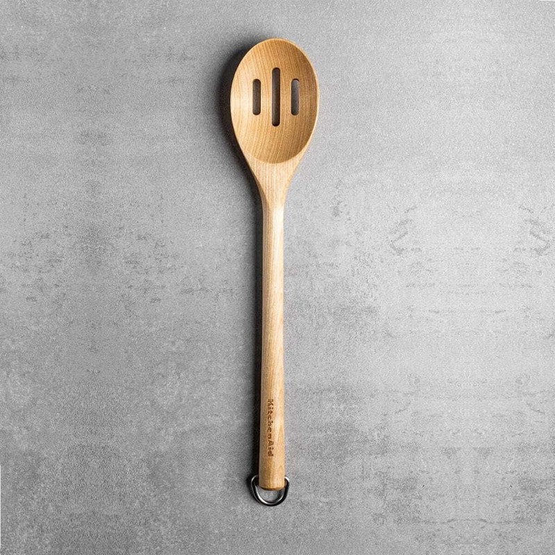 Crafted from environmentally friendly Birchwood, this KitchenAid Birchwood Slotted Spoon is ideal for stirring stews and soups and serving vegetable and pasta straight from a pan of water. Safe to use on all types of cookware and bakeware, including ceramic, cast iron and non-stick, this slotted spoon also includes a handy stainless steel hanging hook.Utensil length: 32.5cm.This KitchenAid wooden utensil is dishwasher safe, although handwashing is recommended for long-lasting performance.The KitchenAid Birchwood Slotted Spoon is supplied with a 1 year manufacturer's warranty.