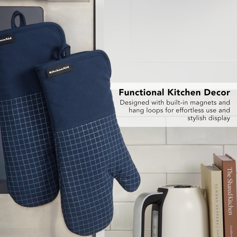 KITCHENAID Gourmet Series Gridlines Oven Mitts 2-Pack Set, Heat Resistant up to 600°F, Soft Silicone Grip, Magnetic Cuff, Ink Blue, 7"x14"