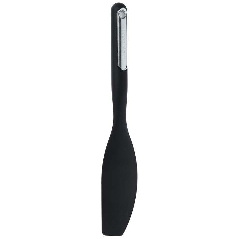 • A flexible silicone head with curved sides are ideal for mixing, scooping, and scraping