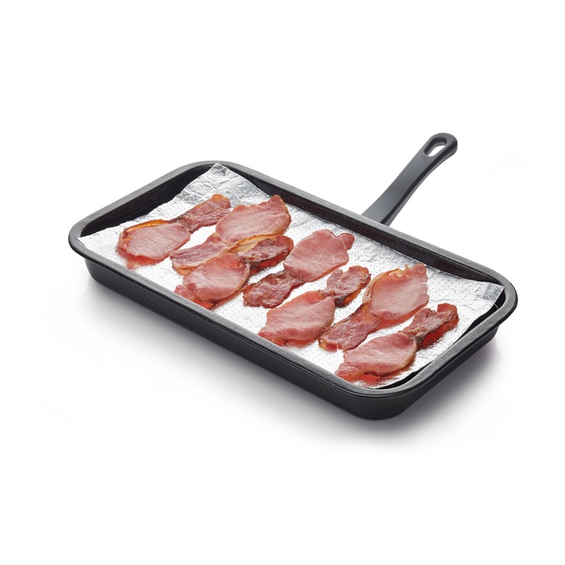 - The silver surface reflects heat, for faster, more even cooking, while micro holes drain excess fat in to the pad for healthier results