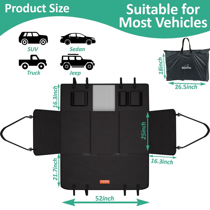 - 【Extra Spacious & Enhanced Support】 Our hard bottom back seat extender for dogs measures 52" x 25", providing 40% more space for your pet’s comfort. Designed with a thickened, reinforced bottom, it supports up to 400 lbs, offering sturdy support for dogs of all sizes. Compatible with most cars, SUVs, and small trucks, ensuring a secure and comfortable ride.