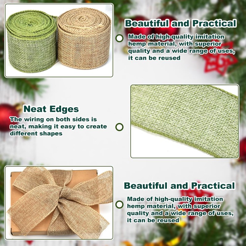 - 【2 Different Color】: This set includes 2 rolls of burlap ribbon, one in a classic green color and the other in a raw hemp color. These versatile hues are perfect for Christmas crafts, rustic-themed projects, or any design that calls for a touch of natural elegance.