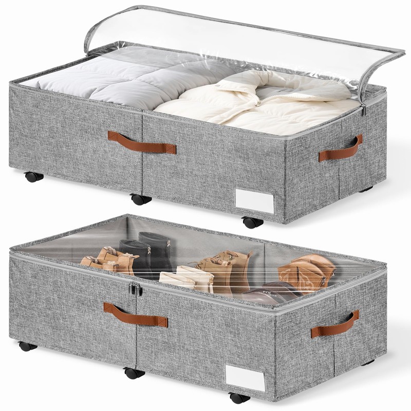 KitHero 60L Large Under Bed Storage with Wheels Pack of 2, Underbed Shoe Container Bin with Clear Lid Cover, 10.5 Inches Rolling Under Bed Drawer Storage Bag Basket for Boots Quilt Sweater - Grey