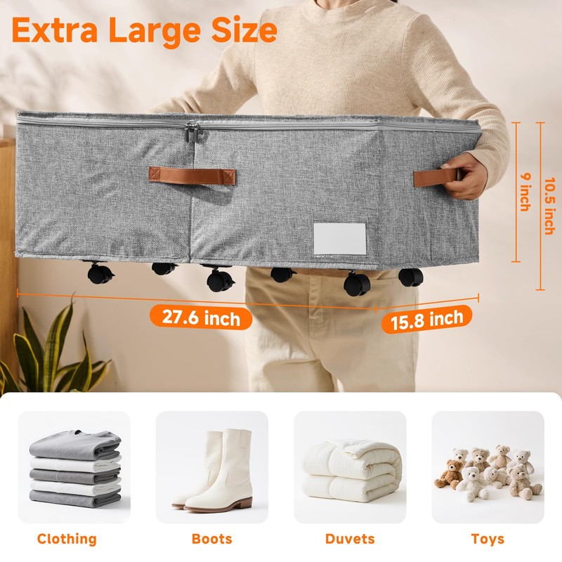 - Larger Capacity: Reach new realms of storage with KitHero underbed storage container with wheels, 10.5” design helps it fit under beds, sofas, tables, and closets, maximizing space utilization. 27.6 x 15.8 x 10.5 inches provide extra large storage space for shoes, clothes, sheets and other home essentials and large bedding items