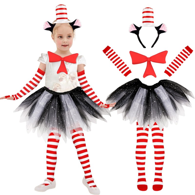 - 【Lovely Tutu Skirt Outfit】This tulle tutu dress for girls set inclued: 1*Black and White Tutu Skirt, 1*Cat Ear Headband, 1*Red Bow Tie, 1*pair of Red and White Striped High Socks, 1*pair of Arm Warmer Gloves. Sweet and playful fluffy tutu skirt, paired with fun headbands and exquisite bow ties, make children instantly become the most dazzling presence in the crowd, satisfies the little girl's princess dream!