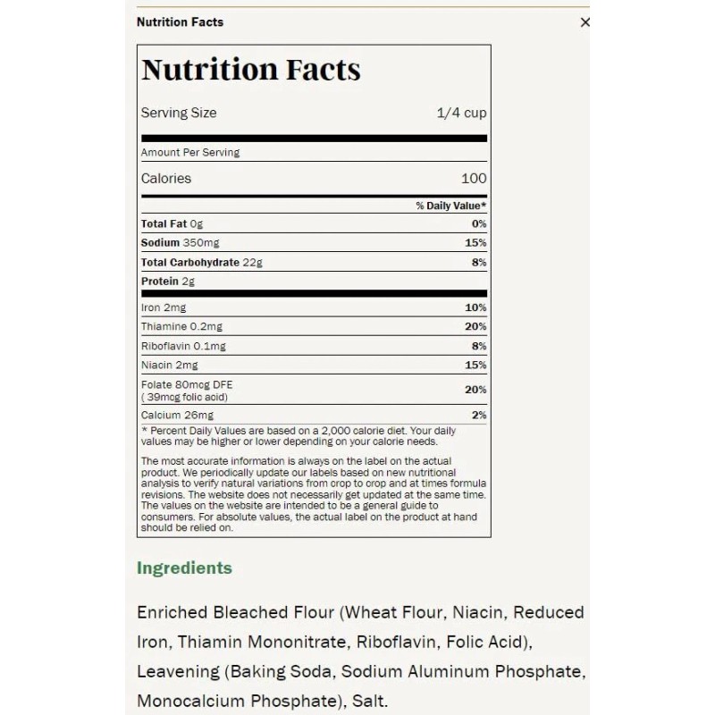 - This product contains these Ingredients; Enriched Bleached Flour (Wheat Flour, Niacin, Reduced Iron, Thiamin Mononitrate, Riboflavin, Folic Acid), Leavening (Baking Soda, Sodium Aluminum Phosphate, Monocalcium Phosphate), Salt.