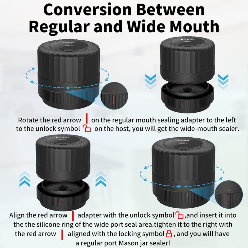 - 【Meet All Your Vacuum Sealing Needs】 Say goodbye to cumbersome manual vacuum pumps and additional accessories. Simply press the button to quickly achieve outstanding vacuum sealing for your Mason jars. Conveniently store fruits, vegetables, beans, nuts, and more. This Mason jar vacuum sealer kit includes 1 wide-mouth sealer, 1 regular-mouth sealer, as well as 1 jar opener, 1 Type-C charging cable, 8 wide-mouth jar lids, 8 regular-mouth jar lids, and a comprehensive instruction manual