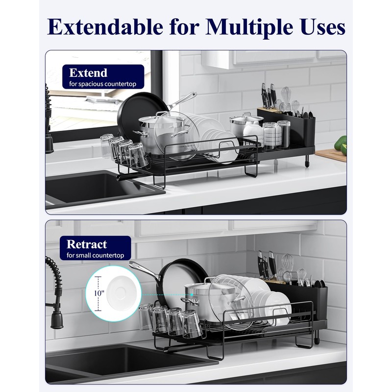 Kitsure Large Dish Drying Rack - Extendable Dish Rack, Multifunctional Dish Rack for Kitchen Counter, Anti-Rust Dish Drainers with Cutlery & Cup Holders 19.2"-26.7" L x 12.9" W, Black