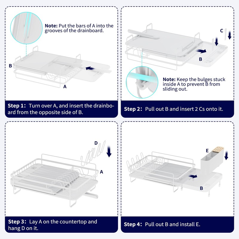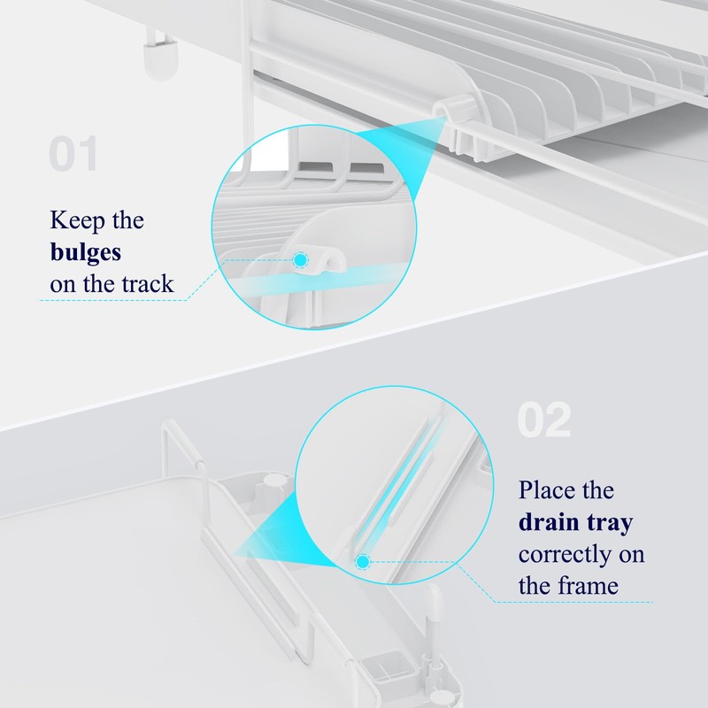 - ANTI-SLIP SILICONE CAPS: The four anti-slip silicone caps can effectively prevent the large dish drying rack from slipping. And there won't be any scratches on the counter as well. Moreover, the heightened fence around the rack prevents the falling of dishes. Rest assured that your kitchenware would be safe in this rack.