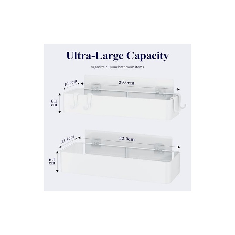- Extra large capacity: the two large shower shelves from Kitsure measure 12.6 inches and 11.8 inches each. They are large enough to store all your bath items such as body wash, shampoo, conditioner, and facial cleanser. The raised railing can effectively prevent your items from accidentally falling.