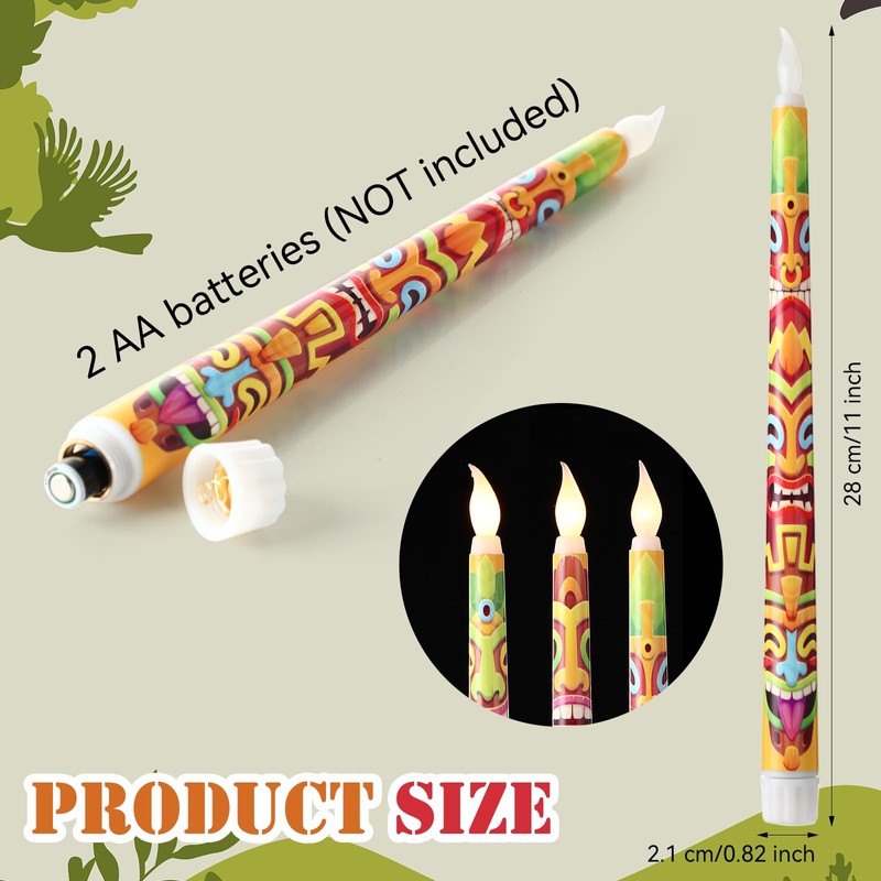 - Summer Design: this 6-pack flameless taper candles features Tiki masks design, bringing a touch of Hawaii to your home decor; These mask candles create a romantic, tropical ambiance, making them a stunning addition to your holiday setup, dinner table, or daily decor