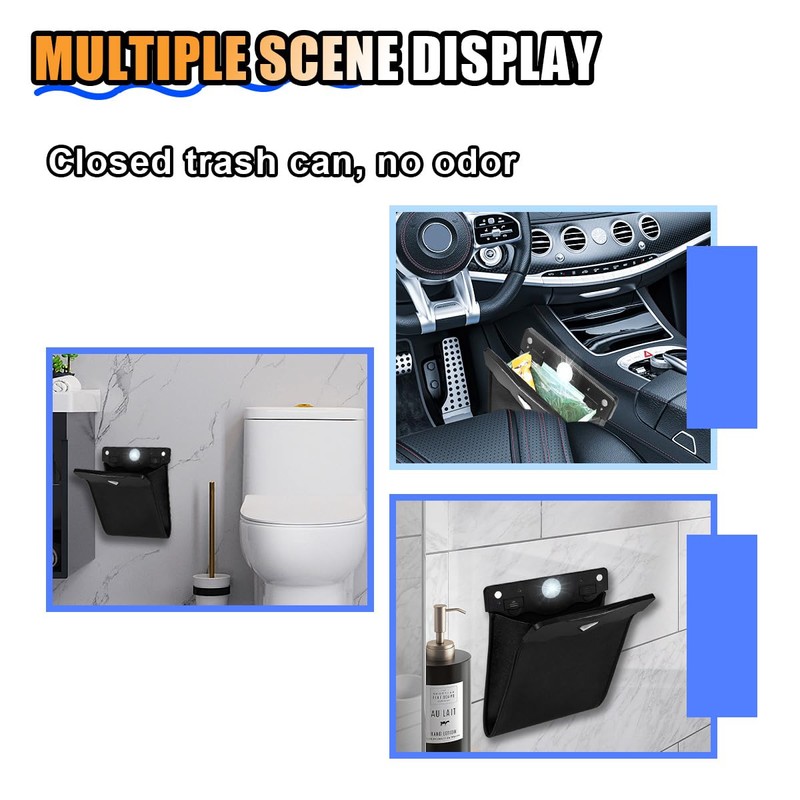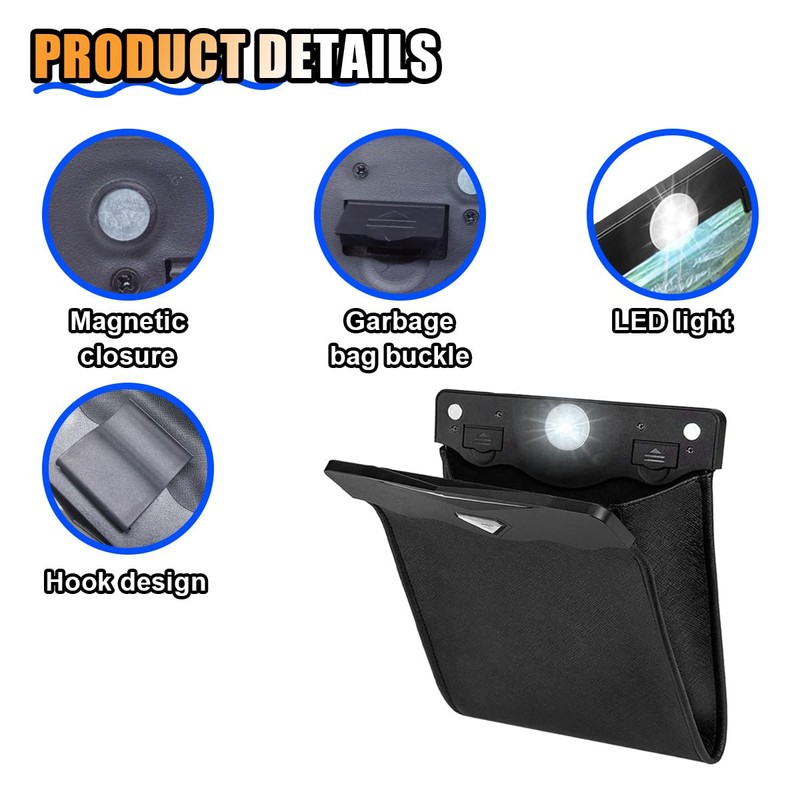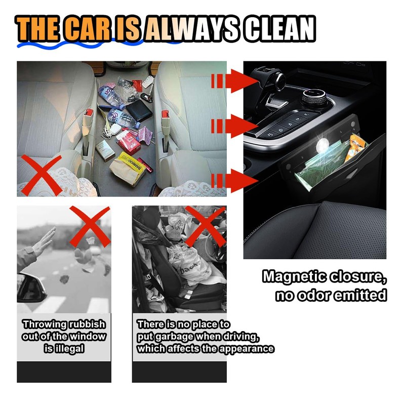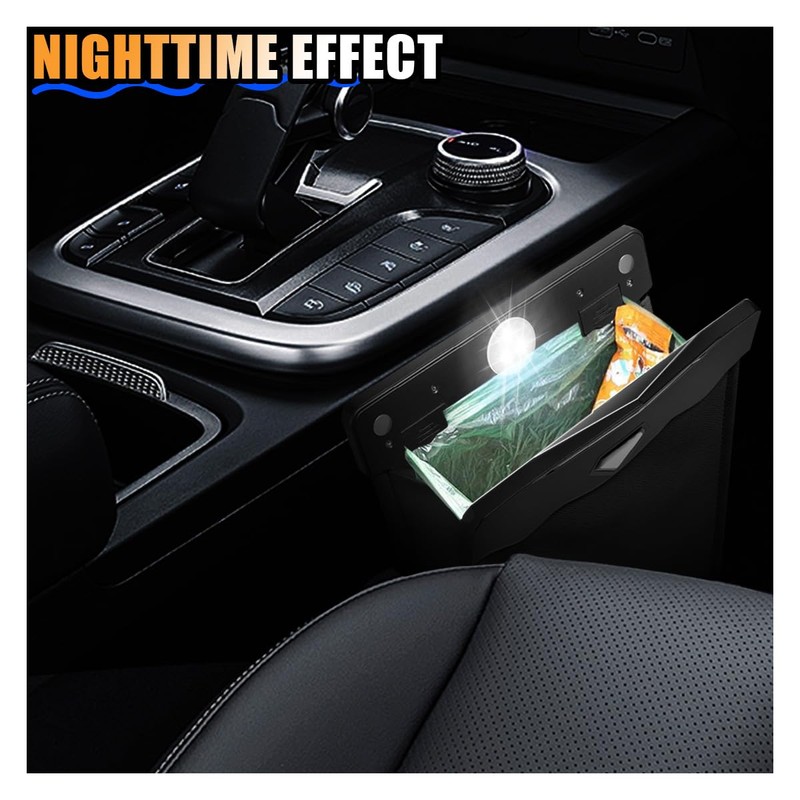 - 【Smart LED】:The car trash can has a built-in LED light, which will automatically light up when it is opened, which is good for night time use. Magnets mounted in the opening allow for easy opening and closing to avoid spreading trash odors. This feature is especially convenient for people who often travel long distances or for families with children who eat in the car.