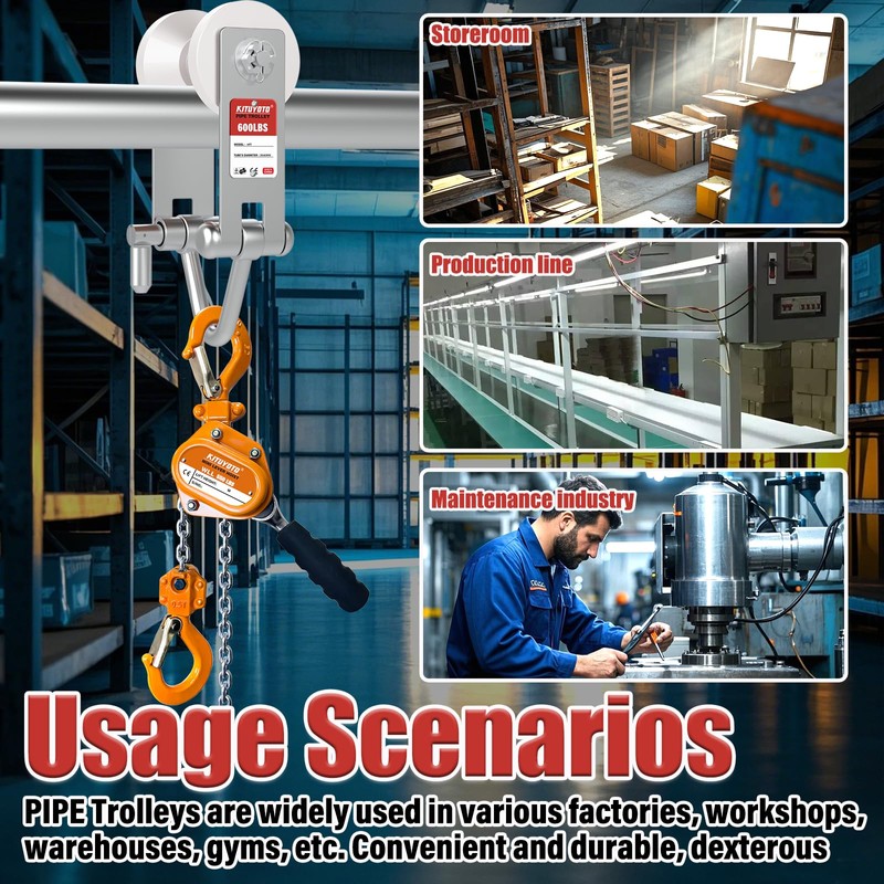 600LB Pipe Trolley Hoist - Ball Bearing Roller Cart for Round Pipe - Compatible w/1.37"-2.36" - Garage Storage & DIY Workshop Lift