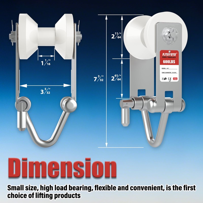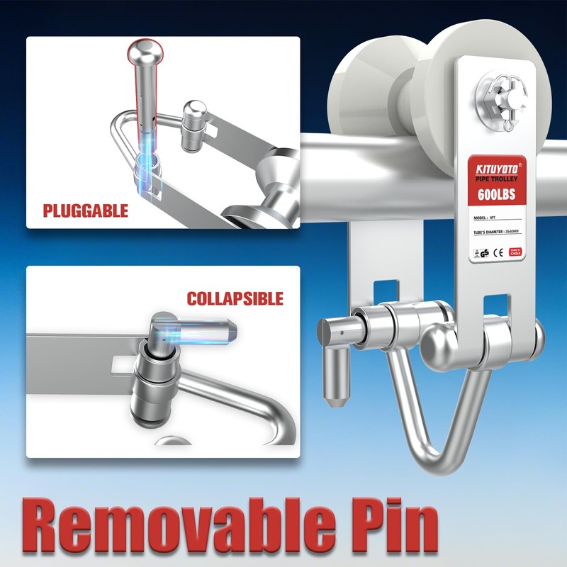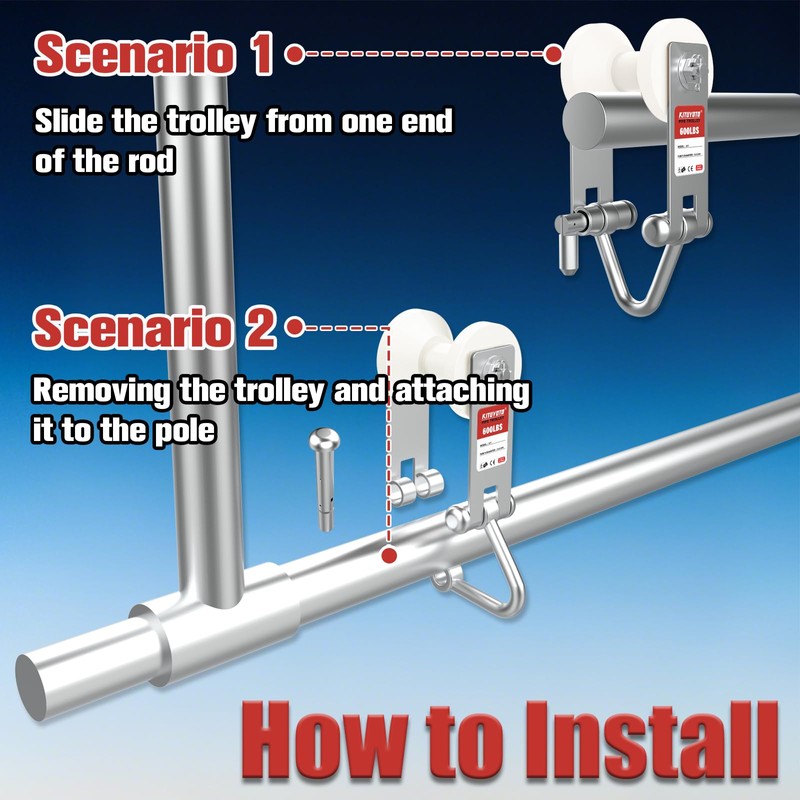 - 3. DESIGNED FOR ROUND PIPE: Engineered to run securely on standard round pipes up to 1.5" diameter. Enclosed track design prevents accidental derailment
